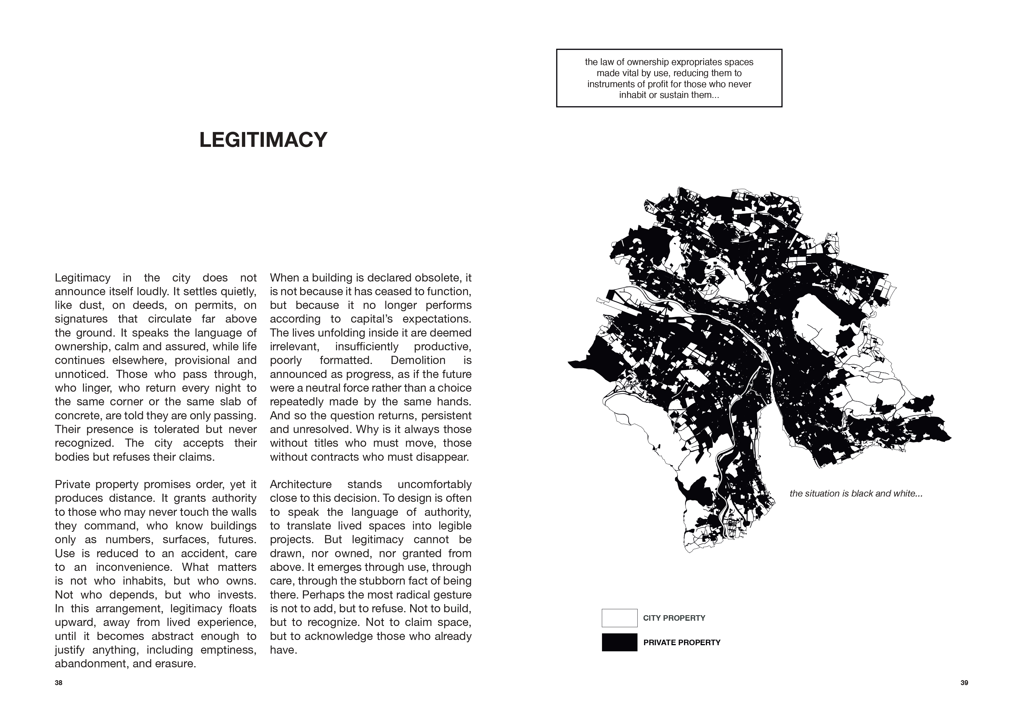 In this context, legitimacy does not announce itself loudly through deeds or signatures that circulate far above the ground. Instead, it emerges quietly through use and the stubborn fact of being there. Private property promises order but often produces distance, privileging those who invest over those who inhabit. The Parkhaus, a concrete ‘non-place’ filled with memories and traces that seem to escape control, challenges this logic. Here, marginalized groups find shelter and autonomy, creating a microterritory defined by care rather than contract, where rules loosen and new ways of living appear.