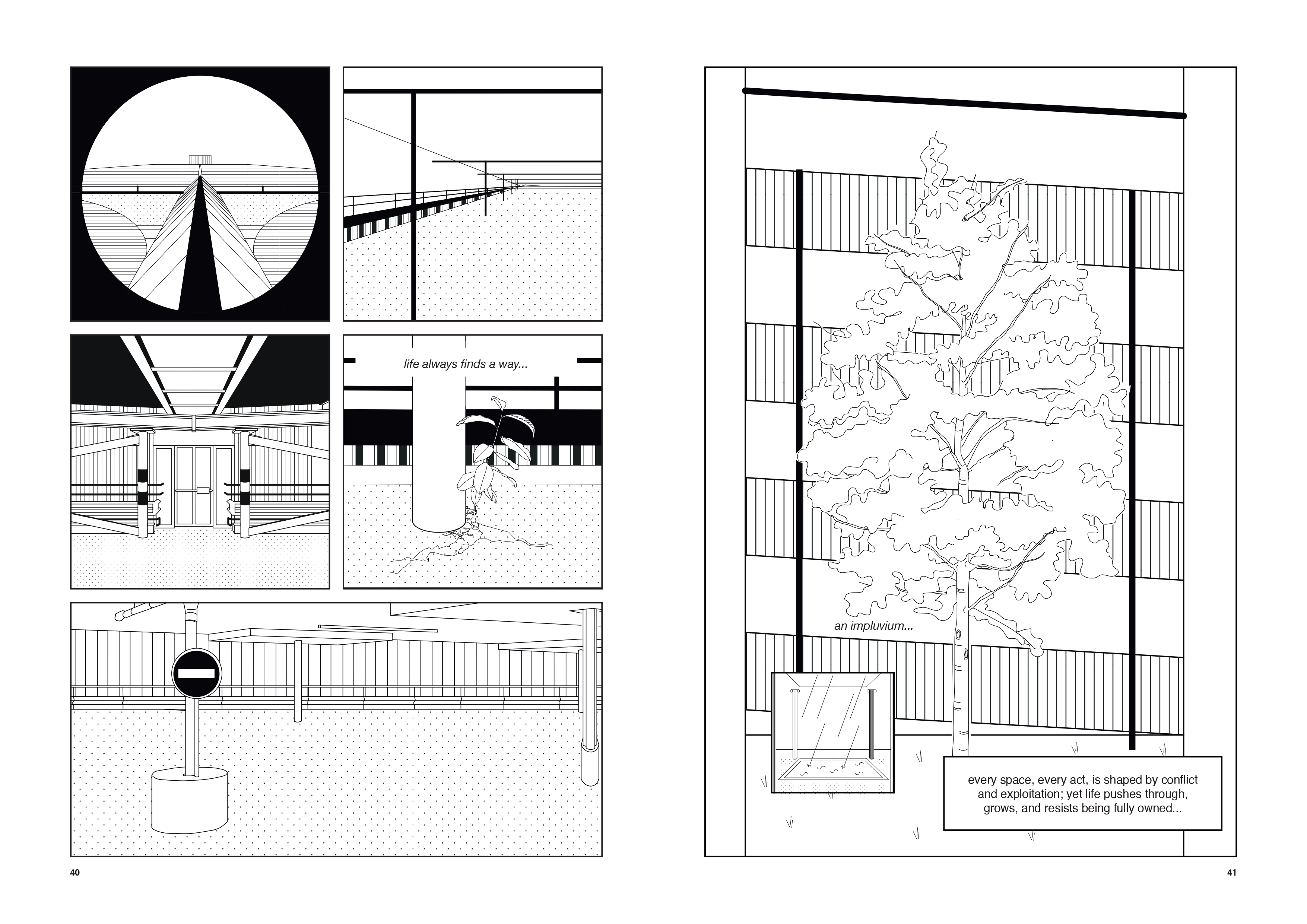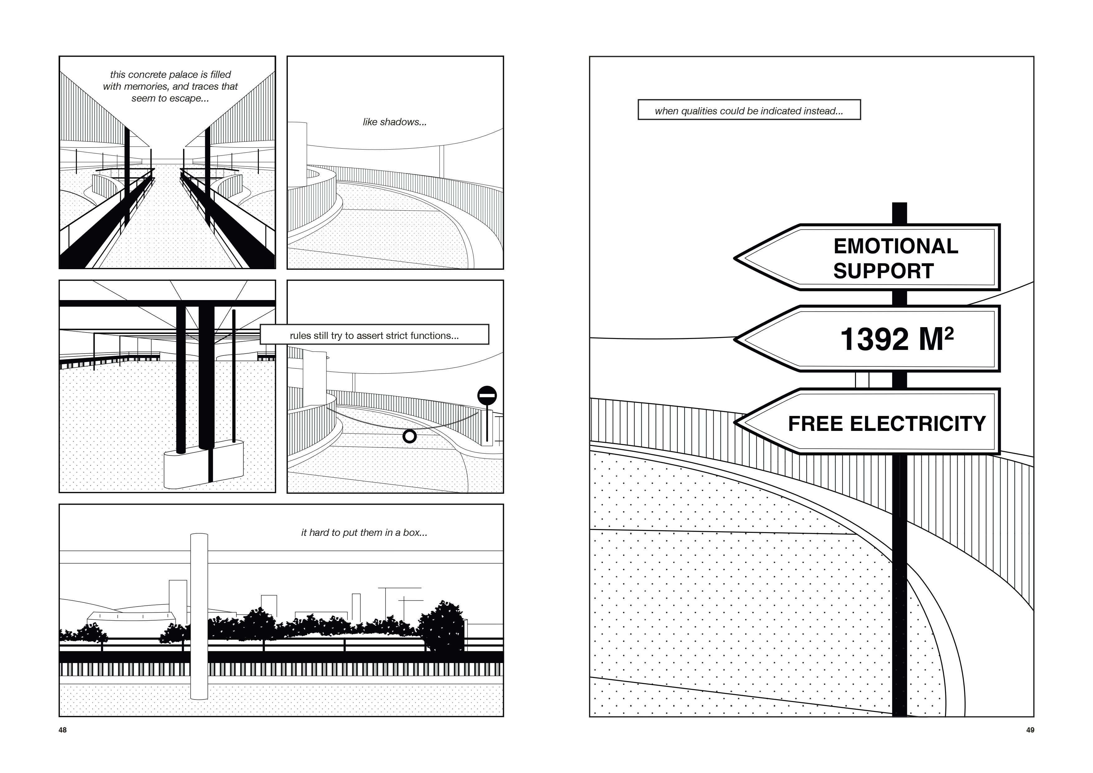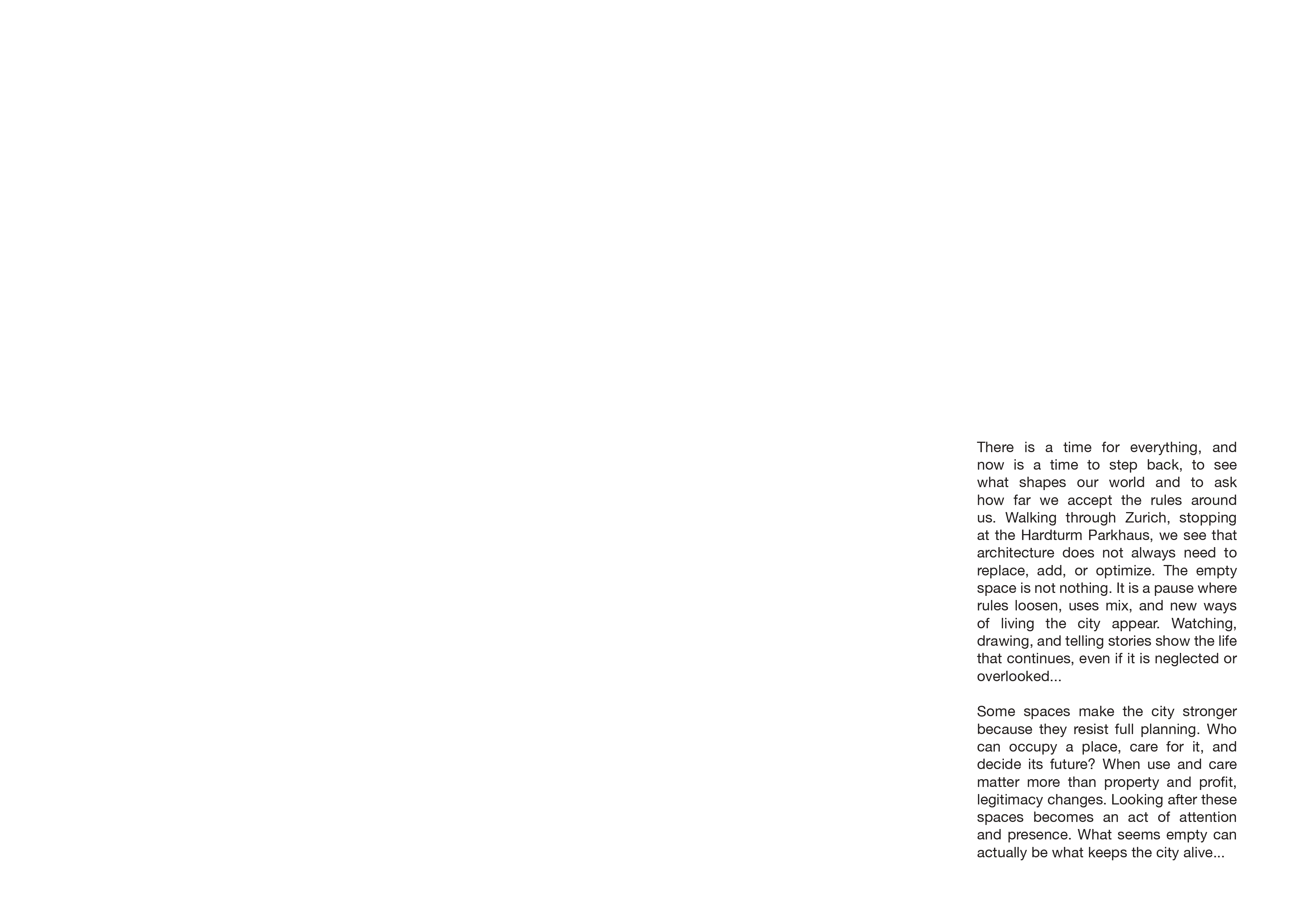 The contemporary city is often reduced to a functional machine, a complex assemblage of economic and political logics where space is organized solely for efficiency and capital accumulation. Yet, within this rigid framework, the Hardturm Parkhaus in Zurich stands as a living ruin that defies standard categorization. It represents a pause in the urban fabric, a void that is neither empty nor neutral but dense with invisible relations, rhythms, and memories. Our project, Let the City Breathe, utilizes the medium of the graphic novel to document these underdetermined spaces, revealing that what official planning disregards as obsolete is actually a vital reservoir of urban resilience.