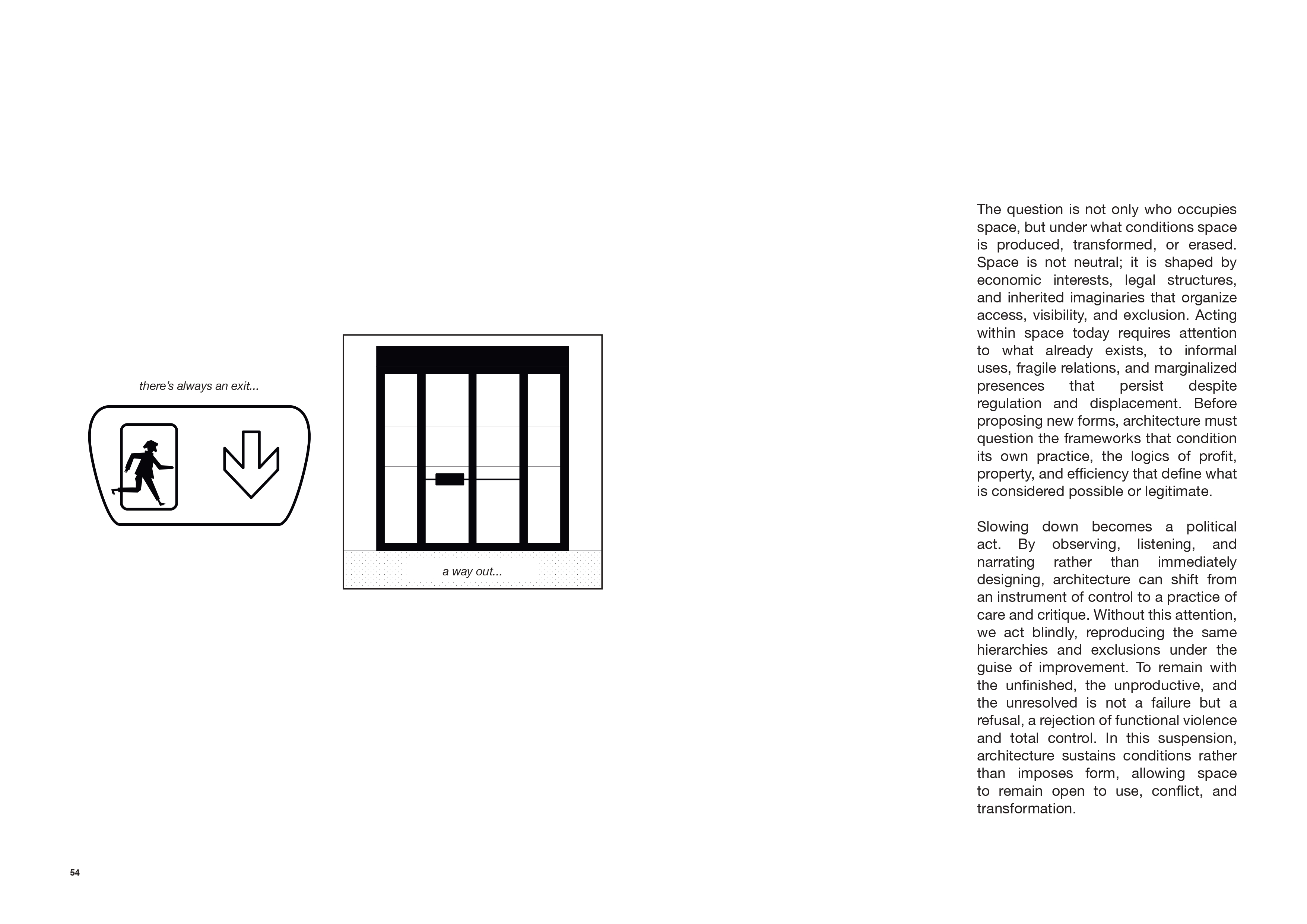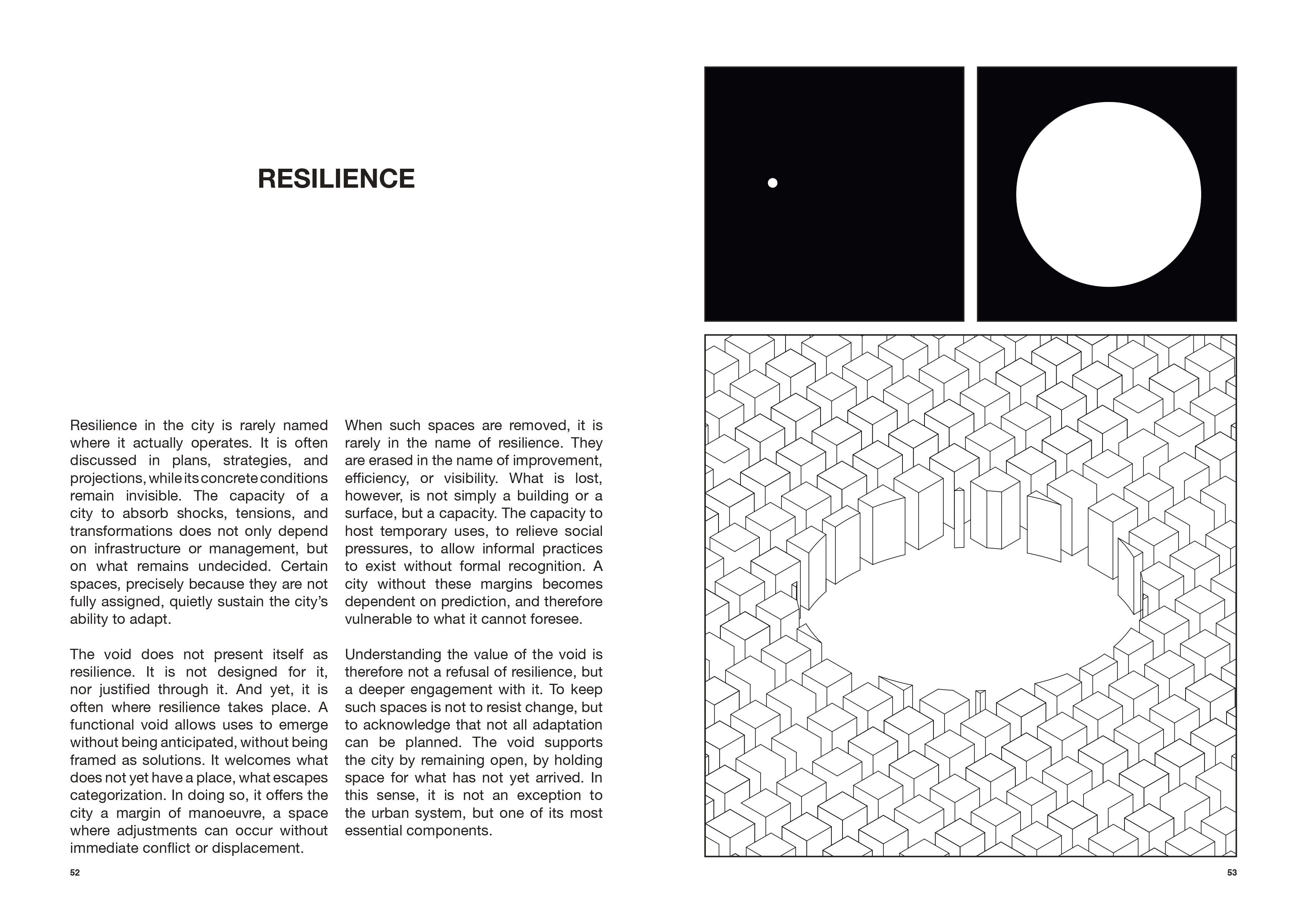 We argue that true resilience depends on what remains undecided. The capacity of the city to absorb shocks and transformations relies on these ‘margins of operation’, where adjustments occur without immediate conflict or displacement. In this context, architectural design necessitates a transition from merely creating objects to serving as a mediator of relationships and temporal dynamics. The empty space is not nothing; it is an active refusal of the imperative to optimize. Looking after these spaces becomes a radical political act of attention, for it is by maintaining these voids that we allow the city to breathe.